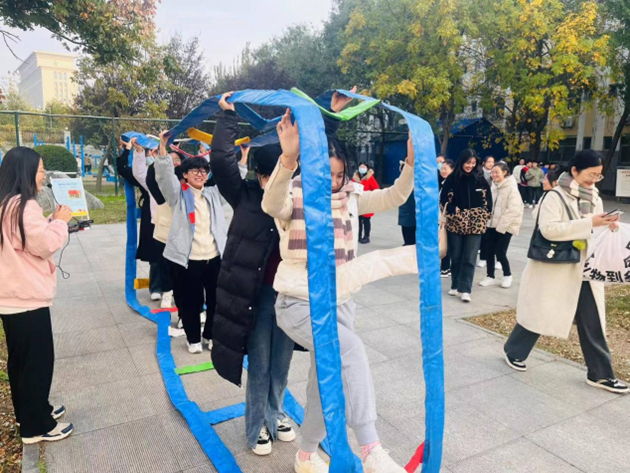 本次心理素质拓展活动共设置能量传输、有轨电车、击鼓颠球、不倒森林、盲目障碍、梅花桩六个项目。活动伊始,心理健康教育中心助理对参加活动学生讲解活动项目的规则和注意事项,强调安全第一,并进行分组。在助理的带领下,同学们乐于尝试、勇敢挑战、默契合作,在冬日挥洒激情,体验喜悦和幸福。在“有轨电车”项目中,同学们齐心协力,争分夺秒,步伐一致,“电车”有序前进,一路欢声笑语;在“盲目障碍”项目中,同学们彼此信任,团结协作,突破重重障碍。最终,同学们通力配合,圆满完成了各项任务。整个活动中,气氛热烈、活泼有趣,参与学生纷纷表示此次活动放松了心情、减缓了压力,感受到了运动的快乐和团结的力量。