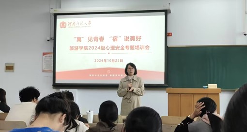 为踏实促进五育并举,着力建设共性教育到胜任力培养的育人新高地,10月22日下午,旅游学院在新五五四教学楼302教室召开 2024级心理安全专题培训会。旅游学院党委副书记翟方,2024级专兼职辅导员及全体班委、宿舍长参与,会议由旅游学院2024级专职辅导员闫依铭主持。