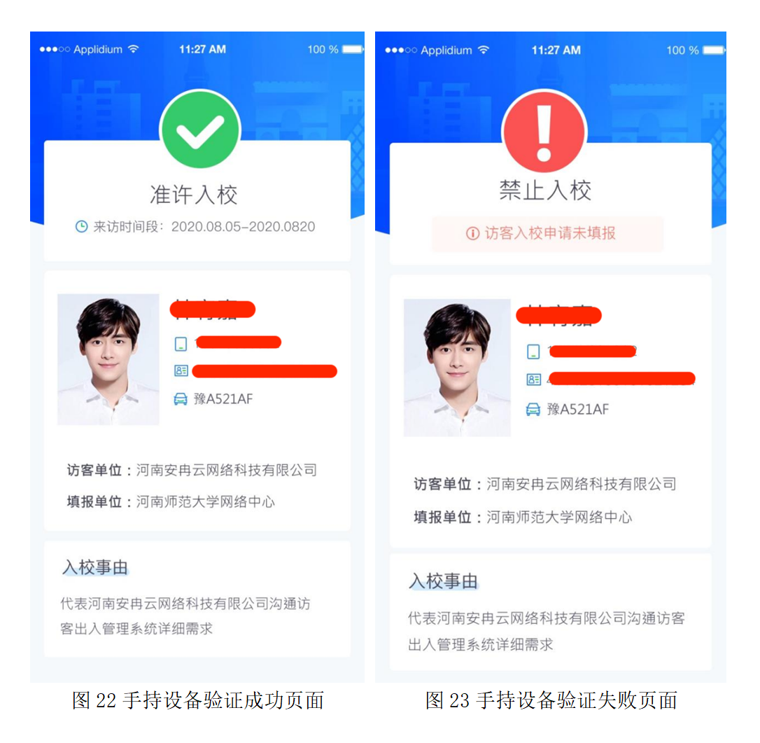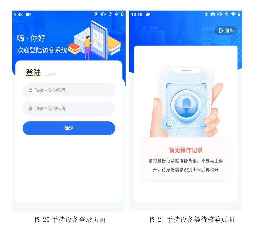 手持设备APP安装好以后直接打开进入登录页,使用门岗班组账号、密码进行登录(如图20),登录成功以后进入等待核验页面(如图21)即可进行访客身份核验。核验结果分为两种:一种是访客信息验证通过准许入校(如图22),一种是访客信息验证失败。