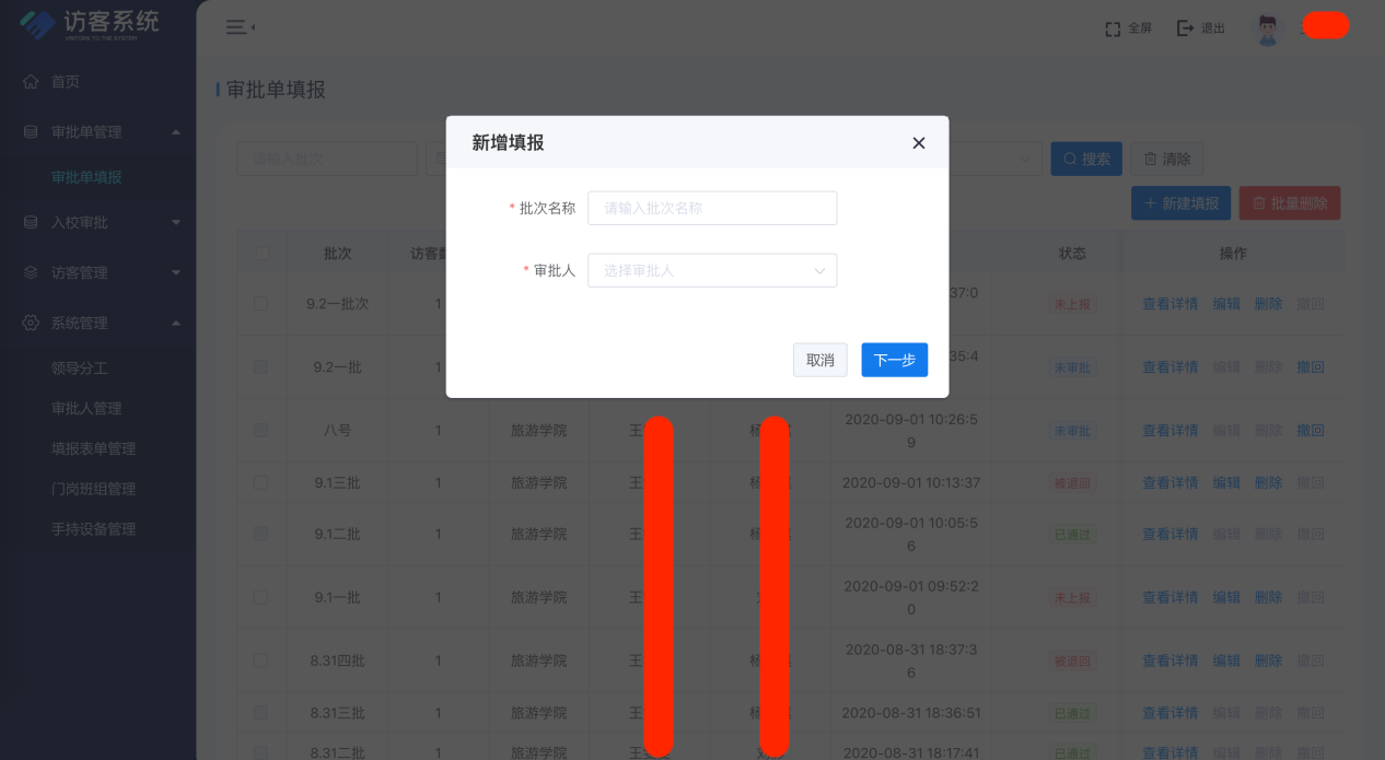 在添加批次页面输入批次名称或主题、选择审批人,点击“下一步”按钮进入批次内容编辑页面(如图11),在该页面添加访客信息。访客添加分为两种,一种是批量添加,一种是手动添加:
