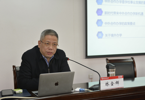 聘任仪式后,林金辉作了题为《中外合作办学的发展形势和政策动向》的专题报告。报告从中外合作办学是学校事业发展的重要组成部分、新时代带来中外合作办学新机遇、中外合作办学政策要点、境外办学四个方面,对我国中外合作办学的发展历史、现状与机遇,中外合作办学政策、内涵、存在的问题及评估制度、境外办学等问题进行了全面、系统、深入的介绍。报告高屋建瓴,具有很强的时代性、政策性、前瞻性,融学术性、教育性、指导性于一体。报告会后,林教授与大家进行了互动交流,回答了大家提出的问题。