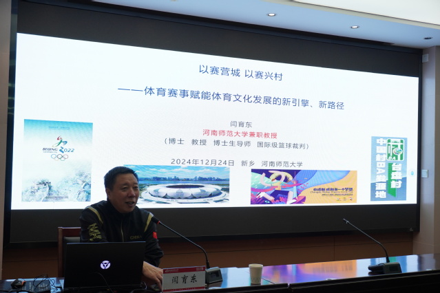12月24日下午,天津体育学院博士生导师闫育东教授应邀为我院师生进行了一场关于《以赛营城 以赛兴村一体育赛事赋能体育文化与产业研究》为主题的专题讲座,报告在体育学院二楼会议室举行。体育学院副院长孟国正、青年教师及学院研究生共计50余人聆听了本次报告。