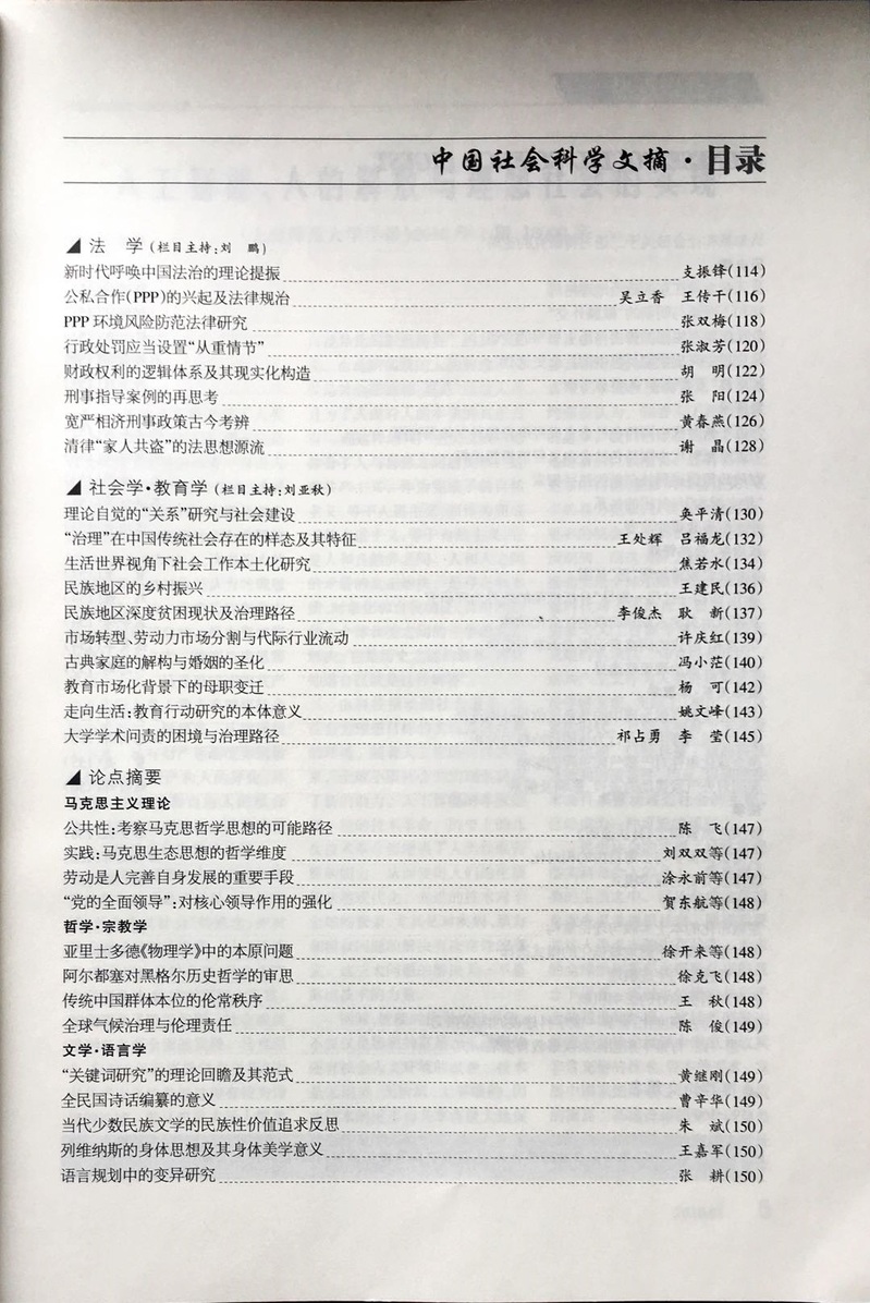 《中国社会科学文摘》由中国社会科学院主管,中国社会科学杂志社主办,是中国社会科学领域具有重要影响力的权威期刊,以全面、权威、重要和可读性著称,与《新华文摘》与《高等学校文科学术文摘》并列为国内三大文摘。在广泛收集、严格筛选和着意梳理信息的基础上,具有形成集学术性、前瞻性、批判性、对策性为有机整体的鲜明风格,是了解人文社会科学领域研究现状和发展趋势的重要窗口。