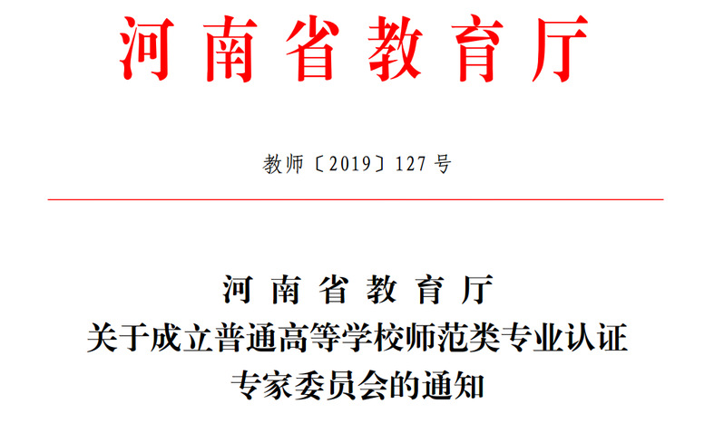 2019年3月7日,河南省教育厅下发了《关于成立普通高等学校师范类专业认证专家委员会的通知》(教师〔2019〕127号),我校党委书记赵国祥担任专家委员会主任委员,副书记陈广文担任副主任委员,副校长李学志、党委教师工作部部长张顺利、教育学部部长宋晔入选专家委员会委员,项目办公室设在河南省教师发展评估院。