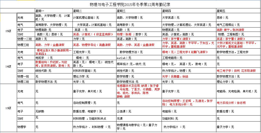 物理与电子工程学院2015年秋季第十二周考勤记录