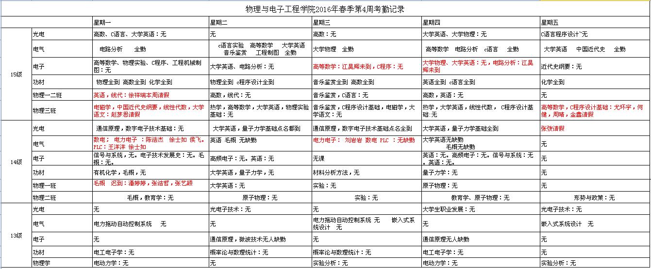 物理与电子工程学院2016年春季第四周考勤记录