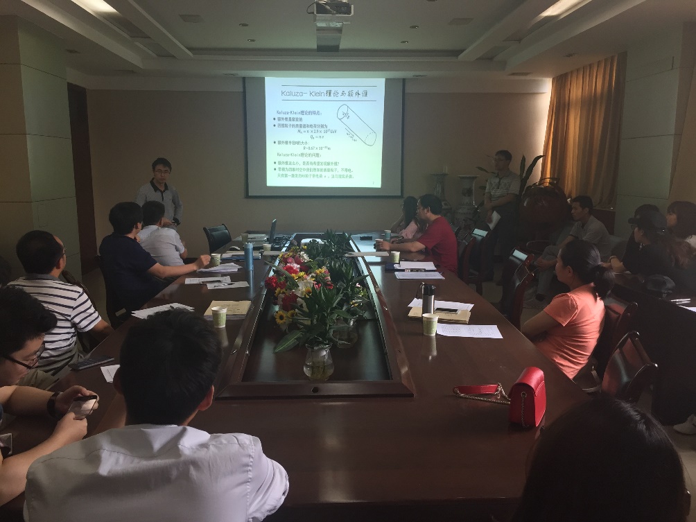 刘玉孝教授作了题为“多标量场膜世界的线性涨落”的学术报告,他首先介绍了Kaluza-Klein理论、大额外维的Randall-Sundrum模型、f(R)膜世界模型等额外维理论模型,具体分析了各种模型的优缺点,并详细介绍了厚膜及薄膜模型的构建工作和多标量场膜世界模型中标量场、矢量场、及引力场线性涨落的稳定性问题的研究现状和前景。