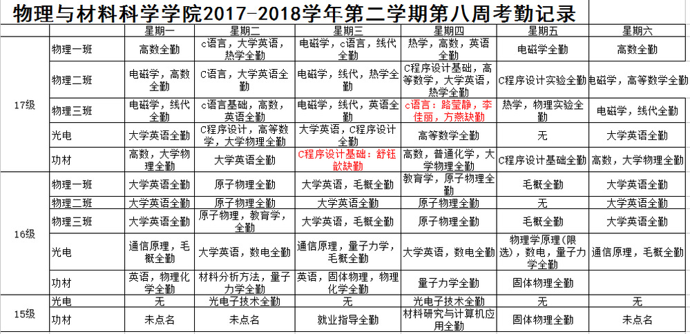 2018-2018学年第二学期第八周考勤记录