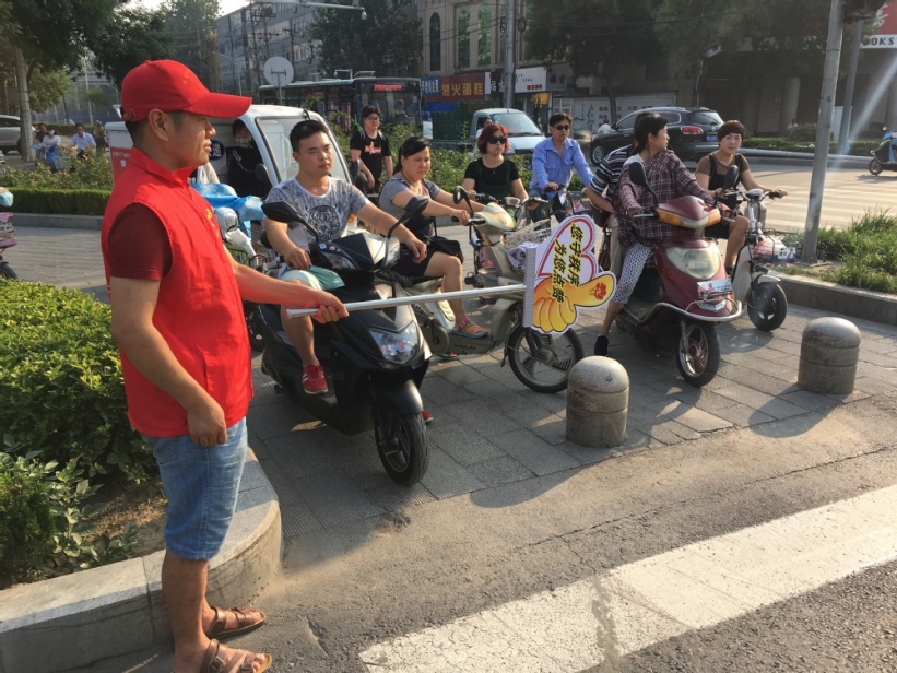 党员志愿者们在活动开始前几天开始认真学习交通劝导知识,为活动做足准备。活动当天,志愿者们身穿志愿者服装,手拿文明交通劝导牌,两人一组在路口四个方向,针对交通路口非机动车和行人闯红灯、无序通行等不文明交通行为开展文明劝导志愿服务活动,协助交警维持交通秩序。