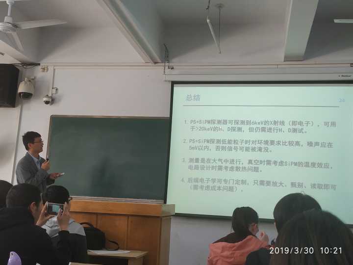 林炜平副研究员以《具有能量分辨和质量分辨的中性粒子探测技术研究》为题,向师生介绍了中性粒子探测技术的研发。在报告中他首先从聚变研究从实验向工程堆迈进,系统的研究设计方案,以及NPN诊断国内外现状等方面向师生介绍了实验研究背景。他基于自己的研究内容,介绍了ps+sipm探测器X射线测试的过程,明确指出ps+sipm探测器可探测到6kev的X射线,可用于大于20kev的H2O探测,但仍需进行H、D测试,接着准确的指出了在剥离单元、剥离介质以及NPN标定技术中存在的一些难题。它基于自己的研究经历,确定细致讲解了在具有能量分辨和质量分辨的中性粒子探测技术研究方面的经历。