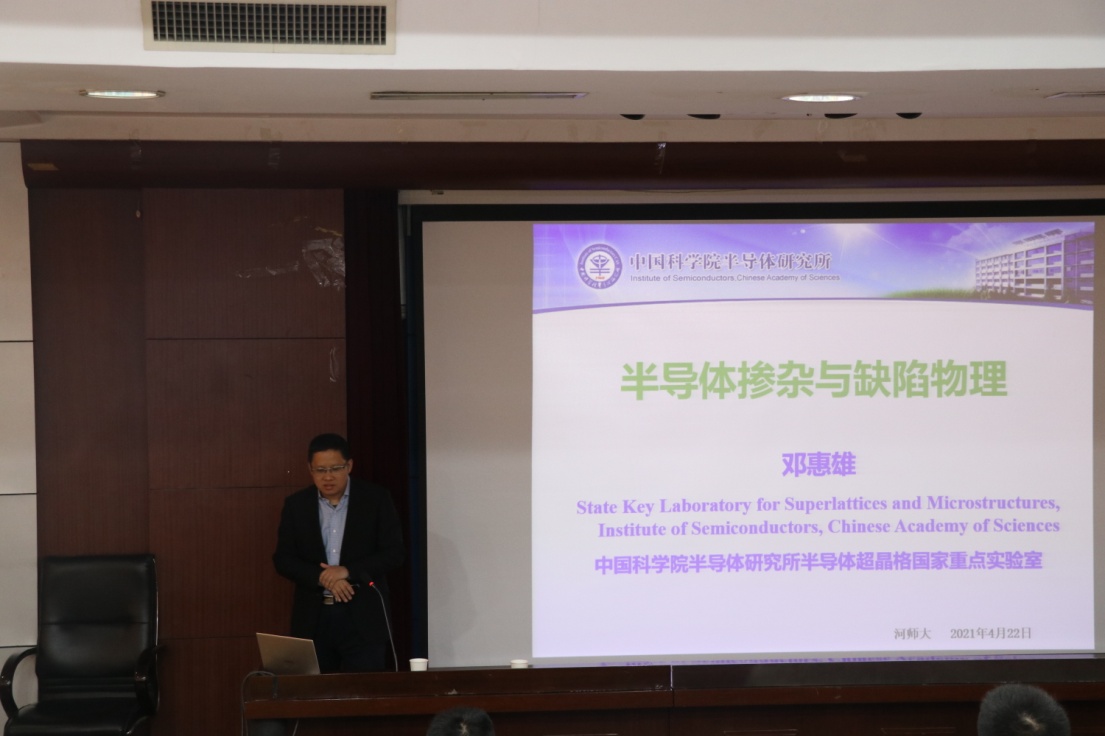 4月22日下午,应我校物理学院邀请,中科院半导体研究所研究员邓惠雄在物理南楼学术报告厅以“半导体中的掺杂与缺陷物理”为题作了学术报告,学院教师、研究生和本科生90余人参加此次报告会。
