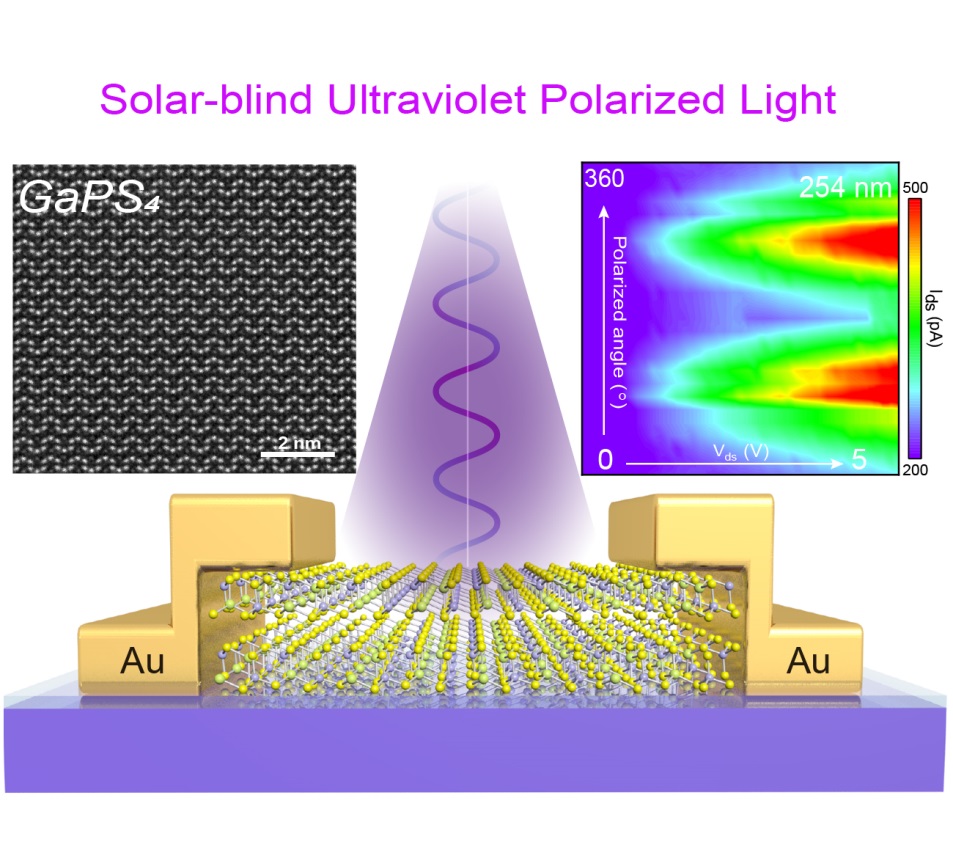 近年来兴起的宽禁带二维半导体,具有天然的短波长选择性和独特的物理性能,是制作高性能紫外光电探测器的理想材料,表现出广阔的应用前景并受到了国内外众多学者的关注。团队以GeS2(Eg = 3.4 eV)为模型,采用共替换的方法设计了新型超宽禁带二维半导体GaPS4材料,并成功的制备出其单晶材料,研究表明此类材料具有更大的光学带隙(单层:4.50 eV)和优越的日盲紫外光探测灵敏度(1.98×1012 Jones)。此外,得益于面内结构各向异性,GaPS4光探测器还具有偏振敏感特性,在日盲紫外偏振探测领域有潜在的应用前景。