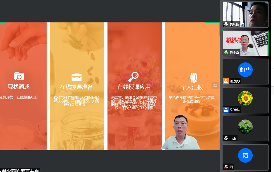 接下来,尹少骞老师从在线教学现状、在线授课准备、在线授课应用及个人汇报四个环节为学院教师进行了全方位的讲解。尹少骞老师着重讲解了雨课堂及腾讯会议的详细使用方法及技巧。培训会后,教学服务团队对老师们的疑问进行了细致的回答。