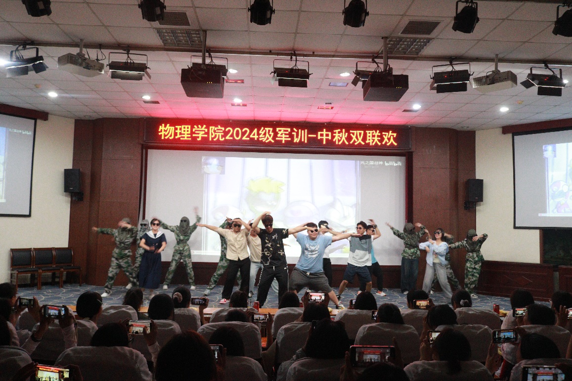 宋艳兵致开幕词,他首先代表物理学院党政领导班子向全体新生致以最诚挚的中秋祝福,对全体新生近期的军训表现表示肯定。他鼓励同学们要尽快适应大学生,树立远大目标,坚持刻苦训练,取得优异成绩。晚会在欢快的舞蹈《你要跳舞吗!》拉开序幕,单人独唱、歌曲串烧、戏曲、话剧等精彩纷呈的节目表演紧随其后,台上同学激情演唱,台下同学欢呼回应,现场气氛气氛热烈,掌声不断。穿插播放的由四位学生家长录制的中秋祝福视频,传达了绵绵爱意与关怀。浓浓情意与祝福,凝结在这中秋共圆的时刻。最后晚会在合唱《起风了》中落下帷幕。