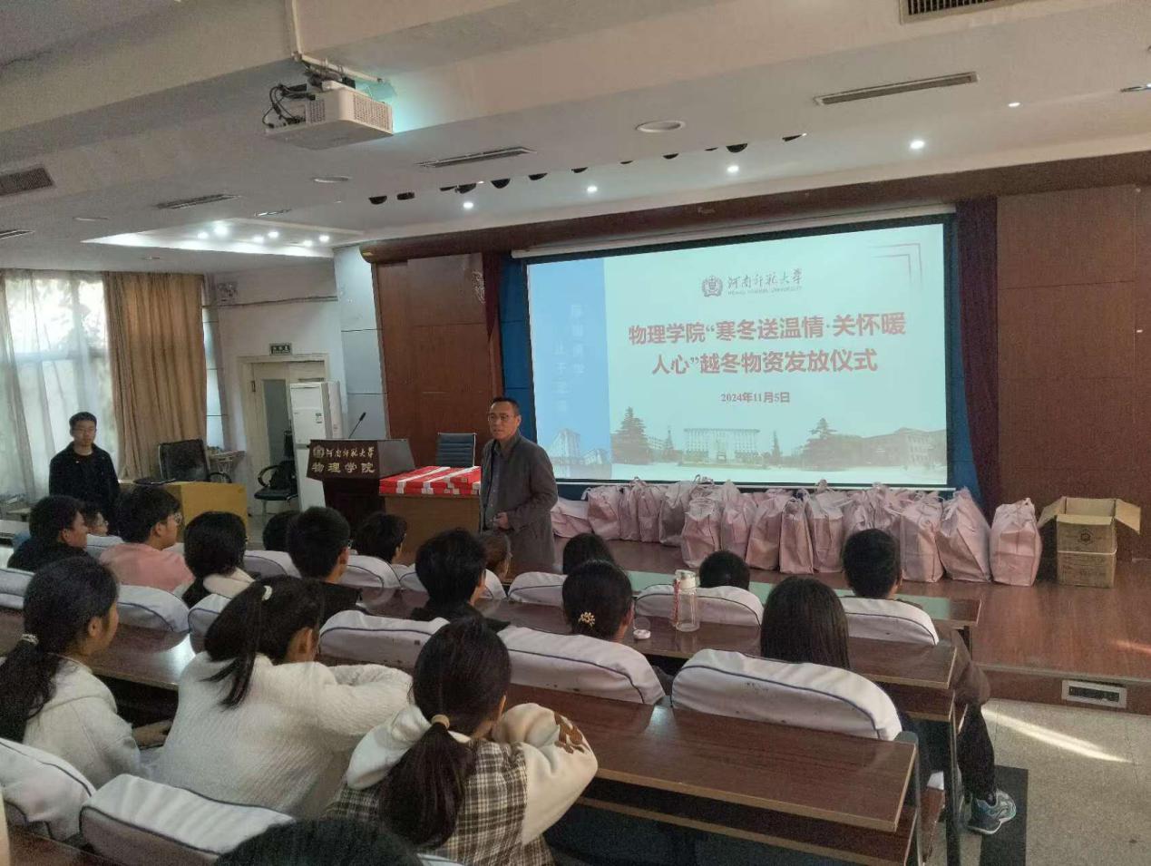 气温骤降,寒意渐浓。为深入落实国家资助政策,提升资助育人实效,保障家庭经济困难学生温暖过冬。11月5日,我院在物理南楼报告厅举办了“寒冬送温情·关怀暖人心”越冬物资发放仪式。物理学院党委副书记宋艳兵、新生辅导员及受资助学生参加了本次活动。
