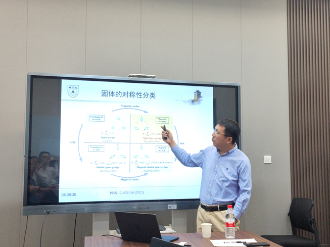 拓扑材料近20年来一直是凝聚态物理领域的研究前沿,特别是近几年,已经从非常材料发展到破坏时间反演对称性的铁磁和反铁磁材料,并且表现出新的奇异物理现象。张老师从典型的非磁性材料Bi2Se3,谈到反铁磁MnBiTe,再到最新发现的交错磁材料中的拓扑性质的调控出发,设计了通过磁场和电场对它们拓扑箱变的调控。张老师的报告内容非常新颖和前沿,特别是利用群论和高通量搜索等方法为我们指出了搜寻这些新型拓扑磁性材料的方案。报告结束后,现场气氛活跃,师生踊跃提问,张老师耐心解答了大家关心的问题,并与在场师生进行了深入的交流与讨论。