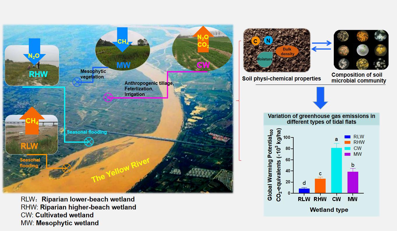 垦殖活动显著促进CO2和N2O的累积排放量,分别是天然湿地的2.10-10.71倍和3.19-8.61倍。100年全球变暖潜势CO2当量在CW最高(81.175 t/ha),分别是RLW、RHW、MW的9.93、3.12、2.11倍。温室气体通量与细菌OTUs (y=0.71x-319.4,R2=0.304)和Shannon指数(y=228.62x-796.6,R2= 0.336)呈显著线性正相关。土壤C、N和水分含量是细菌群落变化的主要驱动因素,进而协同影响温室气体通量。保持黄河漫滩河滨湿地原有状态或恢复耕地为湿地将对减缓温室效应有益。(Lin et al., 2022. Science of the Total Environment. )