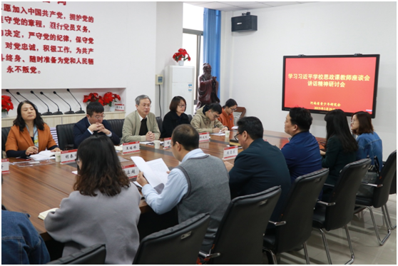 会上,与会人员共同收看了习近平总书记主持召开的学校思想政治理论课教师座谈会视频新闻并进行了热烈深入的学术交流。孟丽艳、郑欢欢等六名与会教师分别就“青年工作的性质”、“郑州青年生活状况的调查”、“如何讲好思政课”、“如何做好思政课一线教师”、“如何让思政课入脑入心”、“坚持问题导向办好思政课”等六个问题分享了自己的看法和观点。