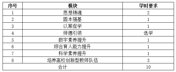 本专题为教师提供8门课程,每门课程提供多个学习资源,教师可以按需选学。其中“思想铸魂”“固本强基”“以案促学”“师德引领”等4门课为“师德集中学习教育”专题的课程(该学习通知已于7月6日发布,现与暑期教师研修合二为一),在6月-7月学习所获得的学时将自动计入本专题。完成本专题学习,平台为教师认定10学时。必须完整观看完所选视频,并完成视频结尾的测试题,才可获得该视频对应的认定学时。