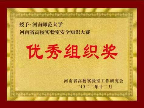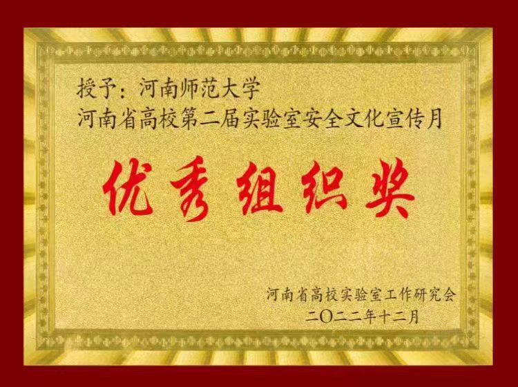 河南省教育厅于2022年9月16日—10月12日开展第二届“河南省高校实验室安全文化宣传月”活动。经高校申报、专家评审等环节,我校荣获“河南省第二届高校实验室安全文化宣传月优秀组织奖”、“河南省高校实验室安全知识大赛优秀组织奖”,9名参赛同学荣获“河南省高校实验室安全知识大赛个人优秀奖”,获奖高校由河南教育厅授权河南省高校实验室研究会颁发证书与奖牌。