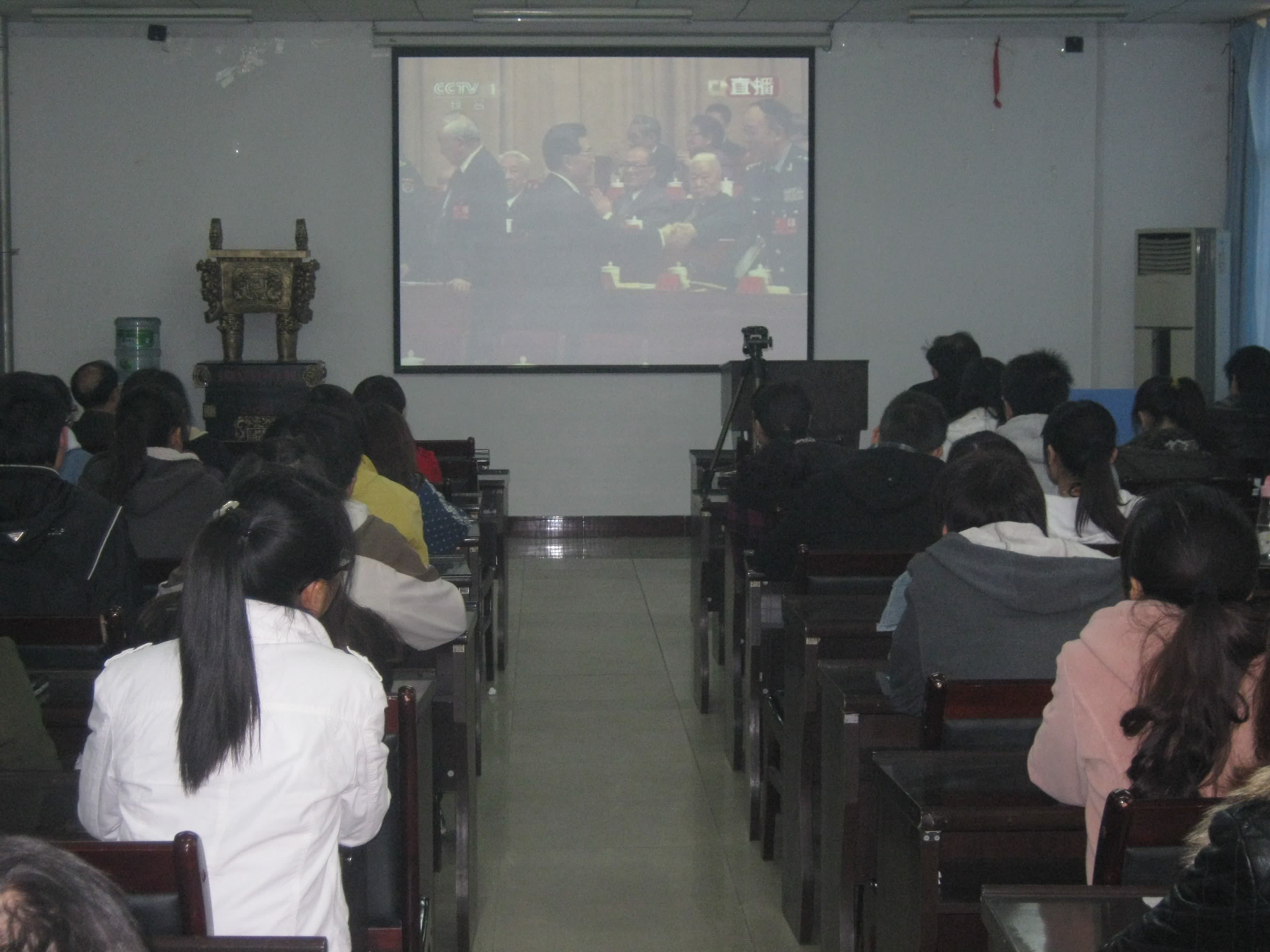 9点整,十八大准时召开,全体学生起立,合唱国歌。全体师生共同聆听胡锦涛主席在开幕式的政府工作报告,投影仪现场视频的播放使得全体师生对会况动态有了更直观的认识,接着大家对报告中的重点、热点做了积极的探讨与反思。并且学院要求学生会后准备2000字的反思报告总结,以便进一步加深同学们的历史使命感与时代价值观。其中在反思总结环节中学生们的表现异常积极,“听取了胡锦涛主席的政府工作汇报,可见政府对民生、就业趋势、房价物价都稍稍侧重,这是我们对未来满怀憧憬,当代赋予的使命与责任必须积极履行。”院学生会主席丁纪涛在会后如是说。