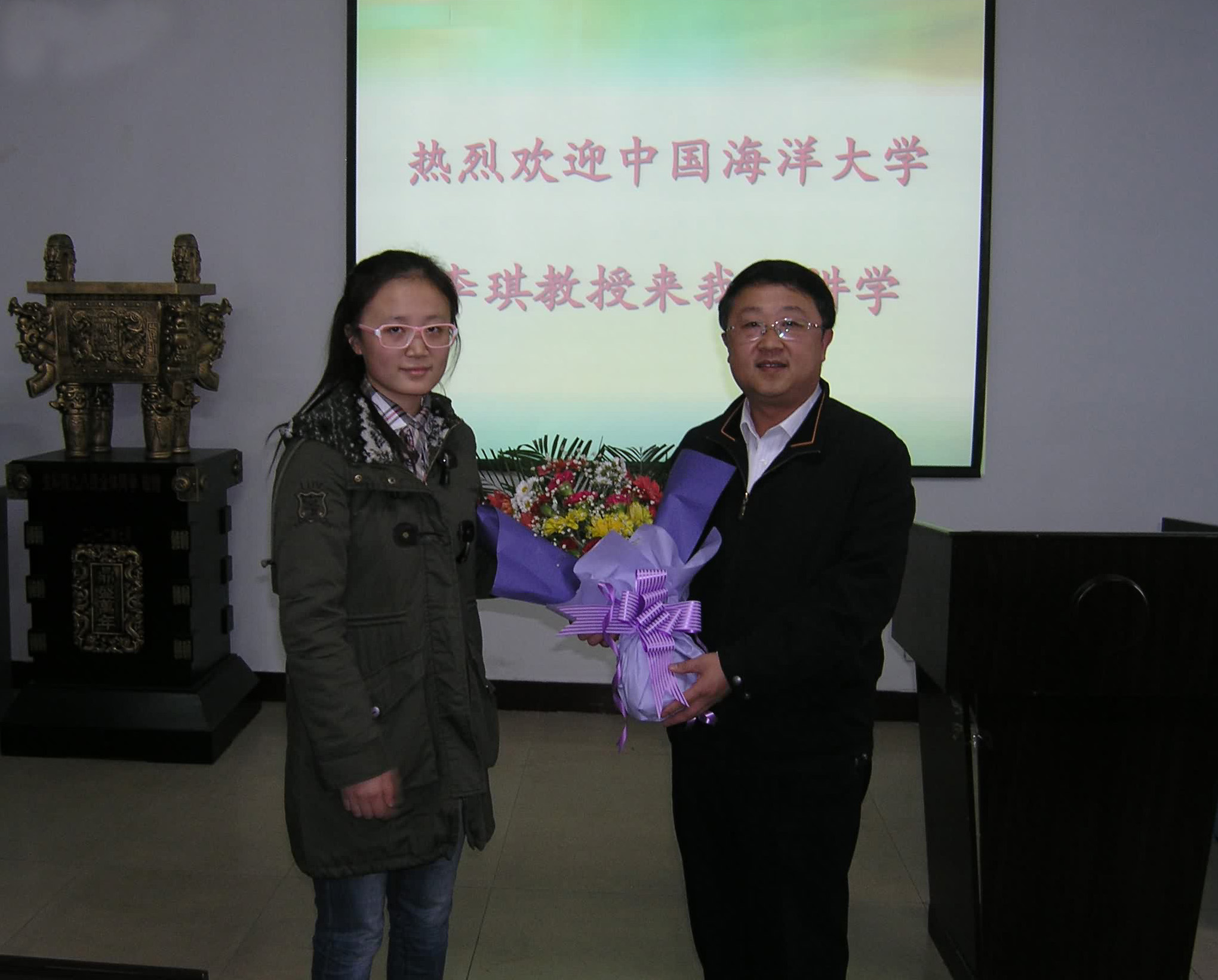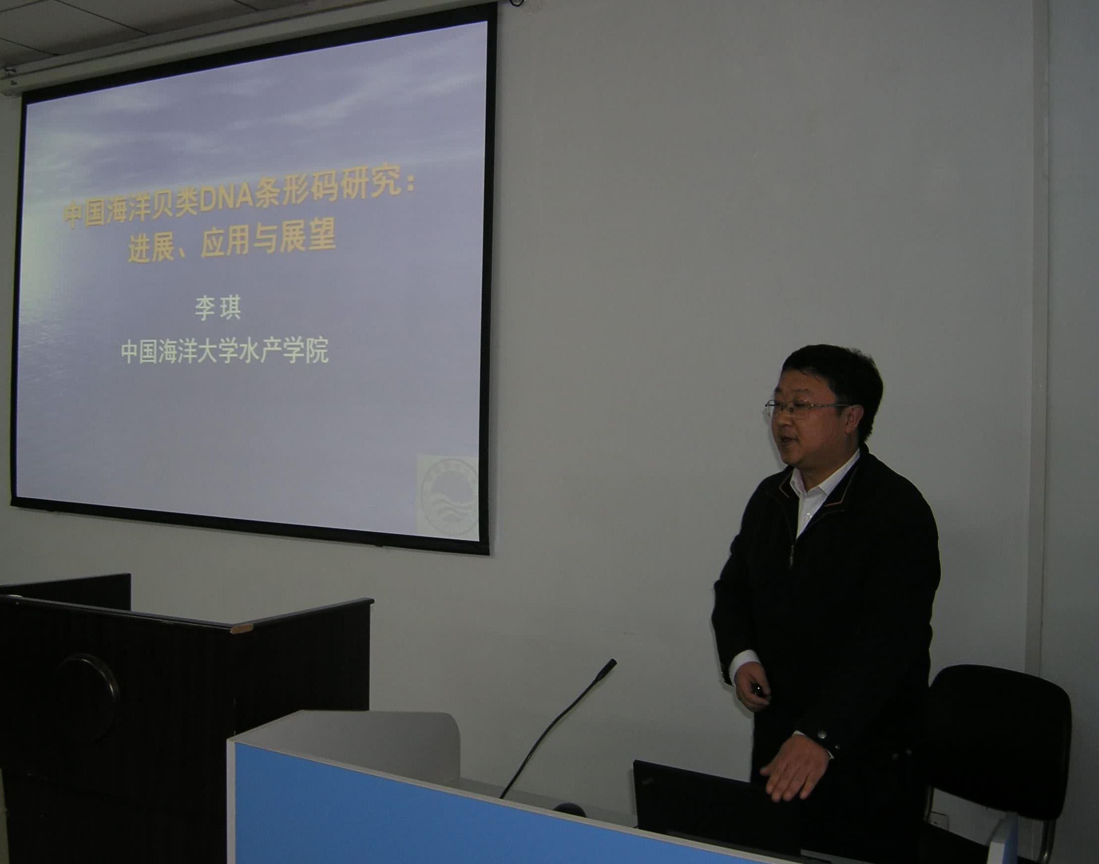 接着李琪教授就中国海洋大学水产学院师资、科研、学科建设、研究生培养等方面做了简要介绍。随后,李教授以“中国海洋贝类DNA条形码研究:进展、应用与展望”为题做了学术报告。他从我国海洋贝类的种类和研究现状出发,介绍了贝类、头足类、螺类遗传基因的结构和特点,及利用COI和16S技术手段在中国海洋贝类DNA条形码研究的成就和今后的展望,阐述了海洋贝类DNA资源库构建的重要性。在活动交流环节,李教授与师生就中国水产现状、海洋贝类基因研究、研究生培养等方面进行了互动交流。