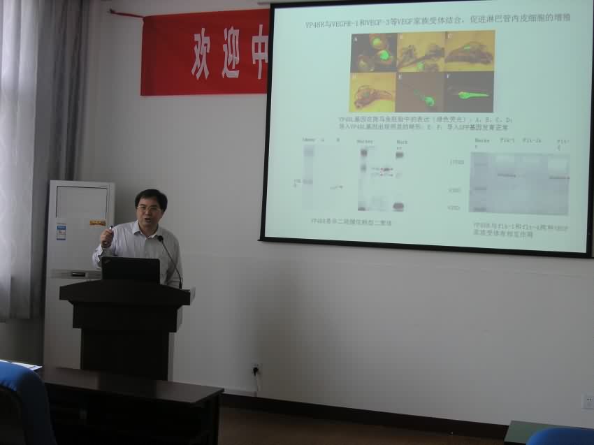 何建国教授首先介绍了“水产动物虹彩病毒的致病机理与防控技术”,详细讲解了鱼类虹彩病毒新属的发现,虹彩病毒对鱼类的危害,以及虹彩病毒敏感细胞系与活体感染模型的建立、细胞入侵、免疫逃避及致病机制,并把基础研究成果应用到生产实践,成功研制出虹彩病毒灭活疫苗和重组弱毒疫苗,对鱼类病毒病起到了很好的免疫保护作用。接着,何教授又介绍了“对虾白斑综合症生态防控技术”,对于对虾白斑综合症病毒(WSSV)宿主范围、传染源、传染途径、致病性、分子免疫学、流行病学及与水体理化因子关系等进行了系统地介绍,提出预防WSSV爆发的生态控制策略,建立了高位池对虾养殖模式、地膜对虾养殖模式和陆地低盐度对虾养殖模式,研发的“白斑综合症生物防控技术”,可有效遏制WSSV的暴发和流行。何教授的报告生动具体、深入浅出,既有深奥的理论研究,又有翔实的技术应用,使教师和同学们受到很大启发,对于科学研究和技术应用有较深的认识。最后,何教授和与师生进行了现场互动交流,对大家提出的问题给予了耐心的解答。