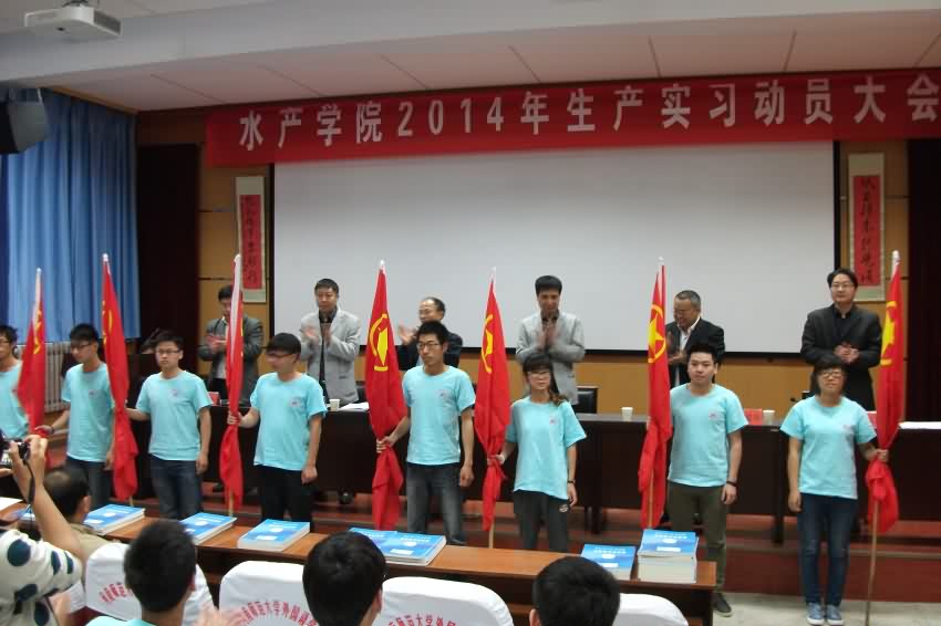 动员会上,李学军副院长首先回顾了2013年的情况,并对2014年的实习地点、实习方案和实习成绩评定作了详细说明;李保华副书记宣读了学院生产实习领导小组名单、实习分组名单、实习队临时团支部和班委组成及实习纪律;随后,与会领导为实习队举行了院旗和团旗授旗仪式;中国水产科学研究院北戴河中心实验站实习队队长张倩、河南康达尔农牧科技有限公司实习队队长蔡玉臻同学分别代表全体实习生、孟晓林博士代表全体实习指导老师进行发言。