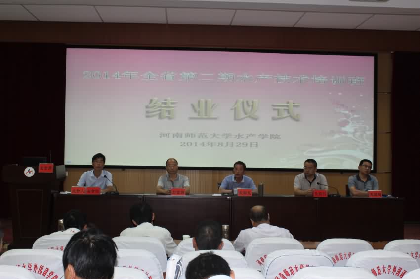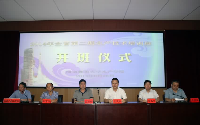 8月19日和8月26日,两期培训班在河南师范大学外国语学院报告厅分别举行了开班仪式。河南省水产局局长张西瑞,新乡市农业局副局长张景水,我校副校长黑建敏,继续教育学院院长武军会,水产学院书记彭富旗、院长聂国兴、副院长李学军、孔祥会参加了开班仪式。开班仪式由河南省水产局副局长武国兆主持。