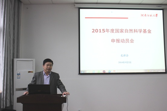 副院长孔祥会教授做了动员报告。他首先介绍了学校和我院2014年国家自然科学基金申报与立项情况,就我院国家基金申报和立项的数量、类别和学科分布等方面做了详细分析,指出了我院2014年国家基金申报工作取得的成绩、优势和存在的不足。随后,介绍了学院2015年有关基金申报工作的安排和要求,并对我院下一步申报国家自然科学基金的日程安排、工作内容及相关要求进行了具体部署。最后,孔祥会教授与全体教师分享并解读了一位今年参加基金会评专家的评审心得,让大家了解了国家基金评审的程序、要求及公正性,并指出国家基金立项的关键是:积累有较好的研究基础,开展有广泛的学术交流,认真撰写一份高质量的申请书。
