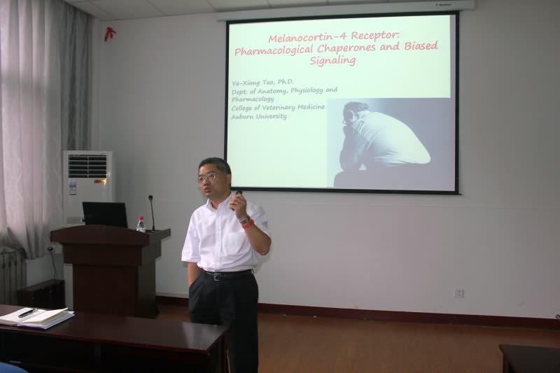 陶亚雄教授主要研究G蛋白偶联受体及其药理学、生理学和病理学意义,尤其是对影响脂肪沉积的黑皮质素(Melanocortin)3和4受体有较为系统的研究。陶教授报告的题目是“Melanocortin-4 receptor: Pharmacological chaperones and Biased signaling”,报告首先介绍了黑皮质素4受体(MC4R)在人类和动物体内能量平衡中的功能与引起肥胖的关系,以及其引发的信号传导的途径;接着,介绍了MC4R突变的四种类型及生理代谢效应,并提出了治疗因受体突变致肥胖的三种途径,重点讲解了药物分子伴侣的作用和筛选方法;最后,陶教授介绍了MC4R信号传导效应与发生突变后的解决方案。陶教授的报告内容丰富、生动有趣,引起现场师生踊跃提问和积极讨论。