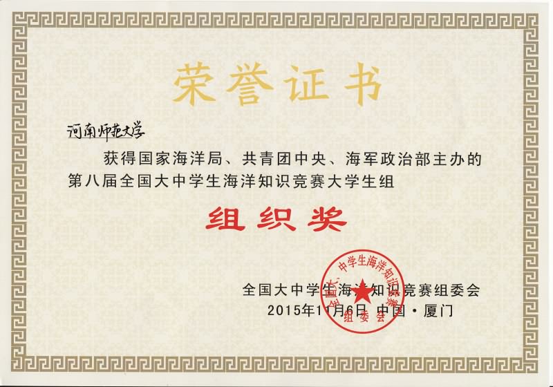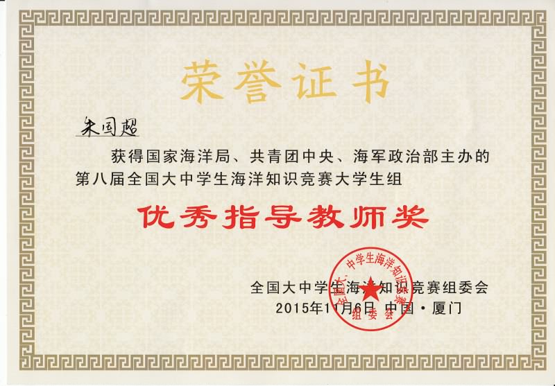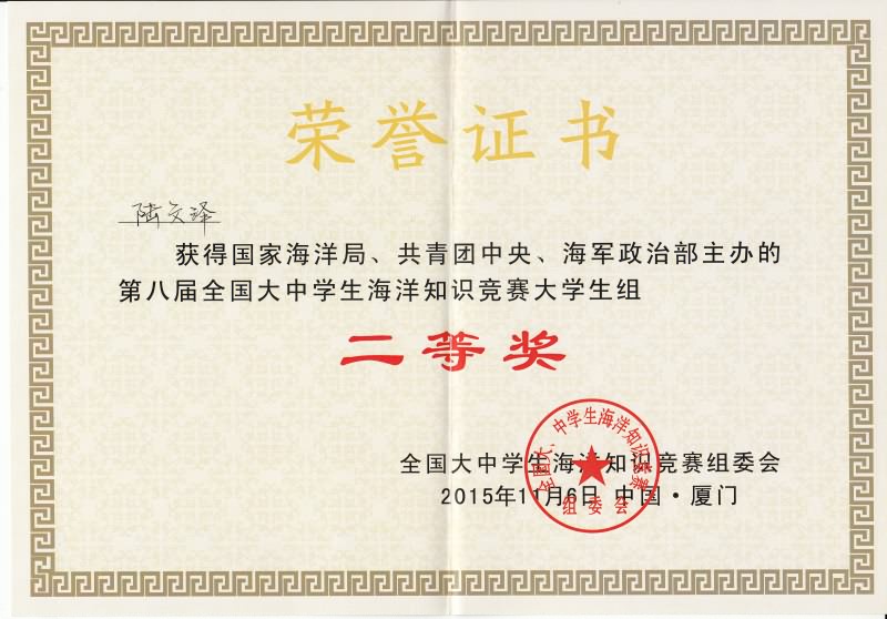 11月6日,由国家海洋局、共青团中央、海军政治部主办的第八届全国大学生海洋知识竞赛电视总决赛在厦门举行。我校水产学院陆文泽同学喜获个人二等奖,朱国超老师被评为优秀指导老师,我校获“大学生组优秀组织奖”。