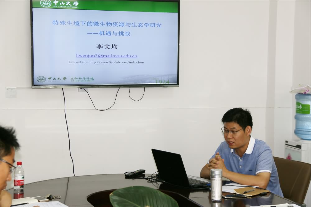 首先,聂国兴院长对李文均教授的到来表示欢迎,并简要介绍了两个科研团队的基本情况和研究方向。接着,李文均教授做了题为“特殊生境下的微生物资源与生态学研究——机遇与挑战”的学术报告,李教授结合实验室研究内容和方向,分别从微生物资源多样性及分子生态、微生物分类及系统学、特殊生境下的微生物生态适应性机制和微生物资源的生态功能利用四个方面介绍了实验室取得的研究成果,特别讲解了基因组水平分类、单细胞基因组测序和蛋白质组学等新技术在微生物资源研究中的应用进展,还介绍了中国“万种微生物基因组计划”和“美国微生物组计划”基本情况,对目前微生物研究出现的机遇和挑战进行了阐释。随后,李教授与参会师生进行了亲切的交流和互动,回答了师生的提出的问题。最后,双方就研究课题的合作和联合培养研究生等事宜达成一致意见。
