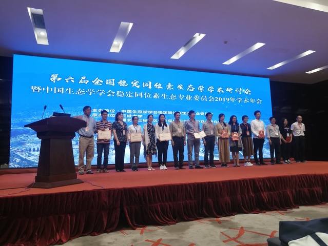 会议为期2天,设有主会场和5个分会场,其中主会场有18场特邀报告,分会场分别围绕水生生态系统结构、功能与服务的稳定同位素研究、植物碳代谢与生态系统碳循环的稳定同位素研究、氮素生物地球化学循环的稳定同位素研究、植物水分关系与区域水循环的稳定同位素研究、产品溯源及其他领域稳定同位素应用研究进行了学术交流。其中,张曼博士题为“南水北调中线干渠中日本沼虾的营养生态学研究”的报告获得“优秀报告奖”(图2)。