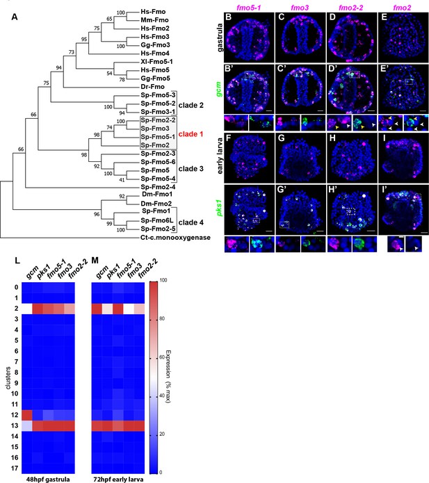 显示海胆FMOs与其他物种FMO关系的进化树 (B-I‘)fmos与gcm或pks1的双FISH (L-M)单细胞数据显示分支1 fmos在簇2和13中被发现