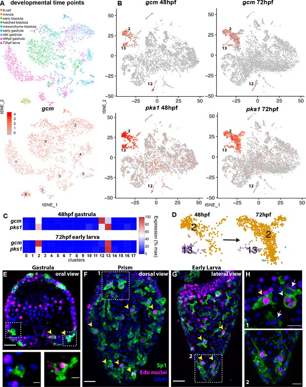 tSNE图显示紫海胆发育9个时间点的gcm富集簇(B)gcm和pks1的原肠胚期和幼体期特征图(C)gcm和pks1在三个簇中的表达(D)两个细胞
