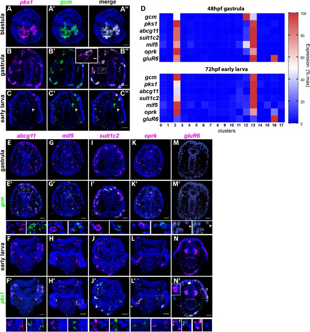 (A-C’’)色素细胞标记基因gcm和pks1的双荧光原位杂交(FISH) (D)色素基因热图 (E-N‘)已鉴定的gcm和pks1色素基因的双FISH分别标记原肠胚期和幼龄期的色素细胞