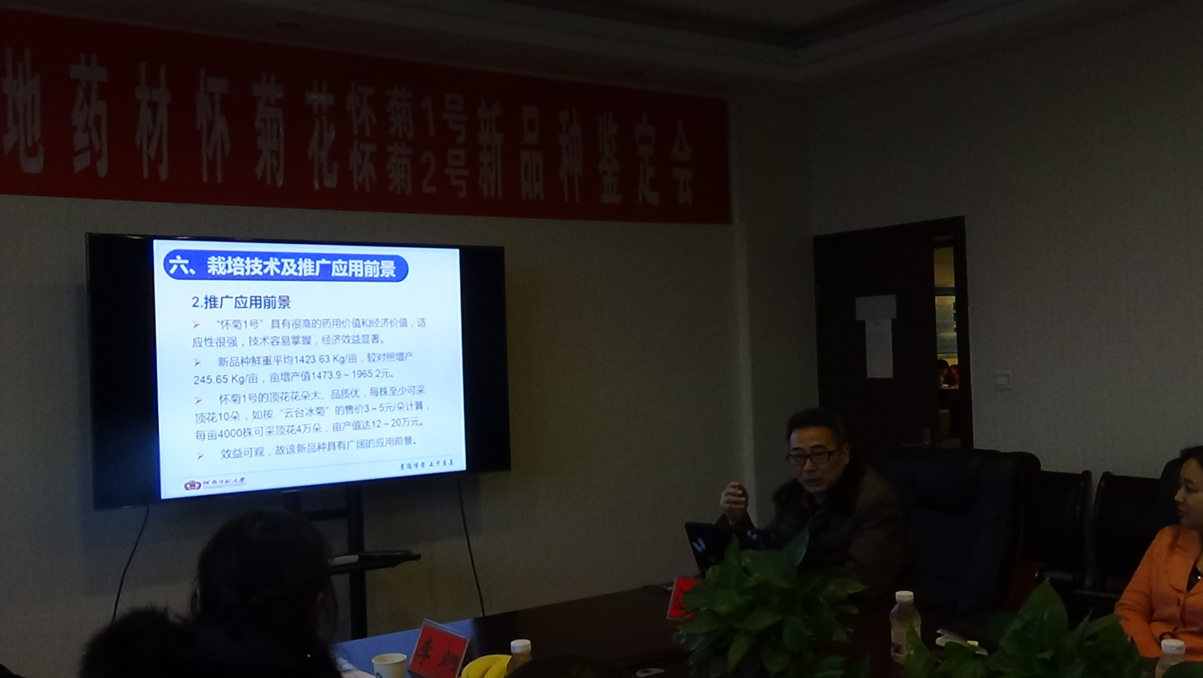 2016年12月25日,省农业厅组织相关专家在我校生科院会议室召开了“怀菊花新品种鉴定会”。由生命科学学院绿色药材生物技术河南省工程实验室主任李明军教授研究团队选育的两个怀菊花新品种顺利通过河南省农业厅中药材生产技术服务中心和河南省中药材品种鉴定委员会的鉴定,成为我省首次通过鉴定的怀菊花新品种。省农业厅中药材中心于红卫主任、校科技处处长郭海明教授、生科院院长李春喜教授全程参加了鉴定会。