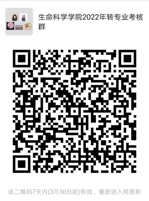 根据《河南师范大学2022年全日制普通本科生转专业工作的通知》和《生命科学学院2022年全日制普通本科生转专业工作安排》,预定于2022年3月26日星期六对拟申请转入生命科学学院的学生按照备案的考核办法进行考核。请拟申请转入生命科学学院各专业,同时经原学院和教务处审核拟通过的学生,扫码加入微信群,以便通知考核、面试相关事宜。