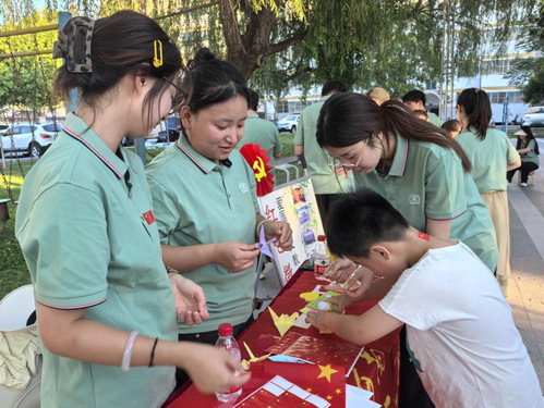 活动聚焦实践体验,精心设置了三个互动环节。“动手做红旗”,在了解国旗的象征意义后,孩子们用稚嫩的小手,小心翼翼地将五角星贴在红纸上,制作属于自己的小国旗。一面面鲜红的旗帜在他们手中诞生,自豪之情洋溢脸庞。“画笔绘赤诚”,拿起画笔,孩子们在画纸上自由挥洒。天安门、五星红旗、家乡美景……童真的视角下,一幅幅充满想象力的画作跃然纸上,无声诉说着对祖国的纯真热爱。“折纸传心意”,活动现场气氛温馨而活跃,志愿者们手把手教孩子们折叠象征爱国的“爱心”和寄托祝福的“千纸鹤”。孩子们全神贯注,虽然折叠出的成品形态各异,但每一件都饱含了孩子们对祖国母亲最真挚的心意。