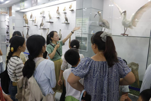 在一层展厅,志愿者讲解员以中华鲟和桃花水母标本为切入点,巧妙地对比了无脊椎动物与扬子鳄的生理结构差异。他们用“从海洋到陆地”的故事,生动串联起生物进化的壮丽轨迹,让观众仿佛穿越时空,见证生命的历程演变。