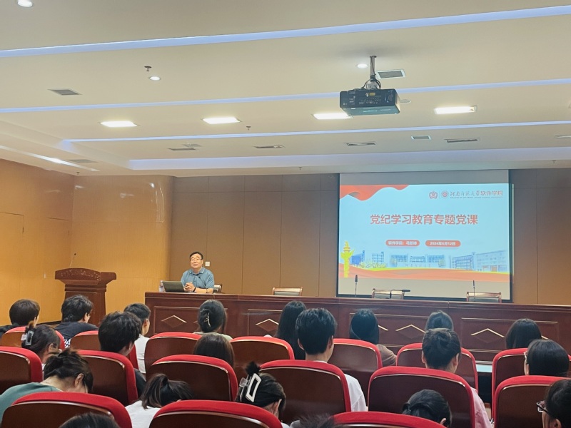 为深入贯彻落实中央、省委和学校党委关于党纪学习教育的部署要求,教育引导党员学纪、知纪、明纪、守纪,进一步加强纪律意识,6月12日下午,软件学院在平原湖校区第二会议室开展党纪学习教育专题党课,学院党委书记马新峰主讲,学院全体新发展党员参加了本次党课。