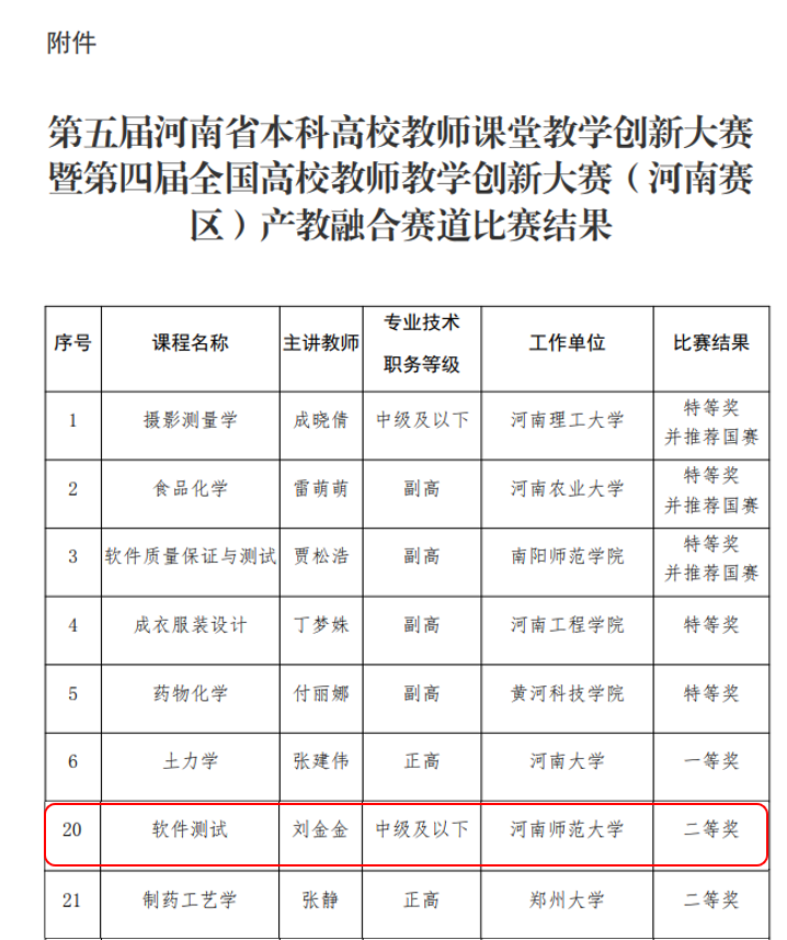 近日,第五届河南省本科高校教师课堂教学创新大赛暨第四届全国高校教师教学创新大赛(河南赛区)产教融合赛道获奖名单公布,软件学院刘金金老师在本次大赛中表现出色,喜获二等奖,充分展现了我院教师的教学创新能力和专业素养。