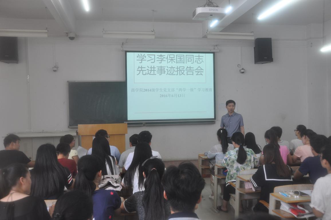 为深入学习贯彻习近平总书记系列重要讲话精神,认真落实“学党章党规,学系列讲话,做合格党员”的教育活动,6月13日上午,商学院2014级学生党支部在东区教学楼A楼201教室开展了“两学一做”学习教育活动暨学习李保国同志先进事迹学习讨论会,我院党委副书记段红伟、党委秘书宋树伟、2014级辅导员周芳、2015级辅导员王岩、2015级辅导员助理张安琪以及2014级全体党员参加了此次的学习教育活动。