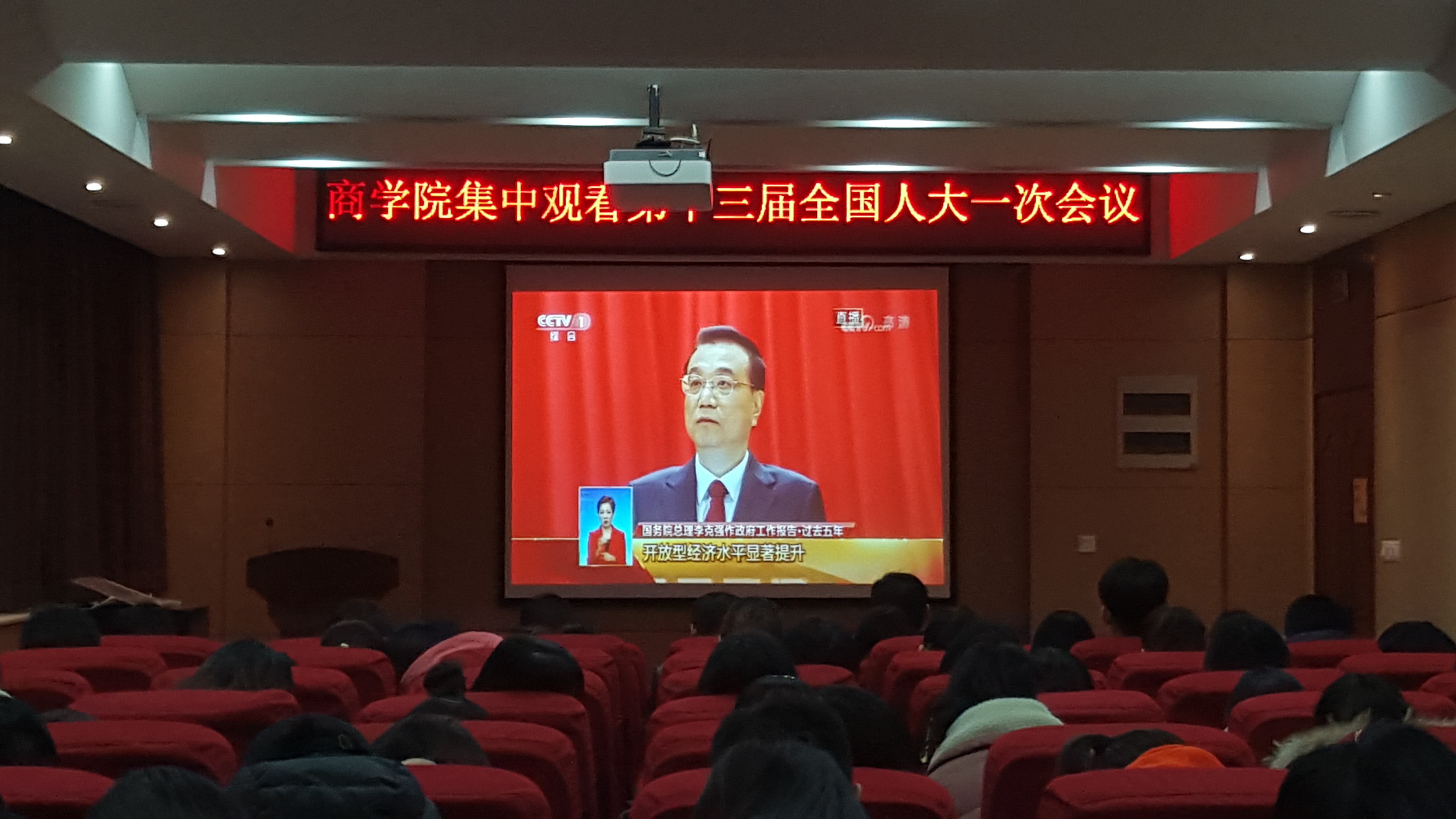 聆听党的会议,谨遵党的使命,共睹党的风采。3月5日上午九时,商学院组织学生于商院楼119报告厅集中观看第十三届全国人大一次会议开幕式直播。商学院党委副书记段红伟、团委书记王岩、办公室副主任李建华、2014级辅导员张安琪出席了本次会议,商学院各级研究生、本科生代表共百余人参会聆听。