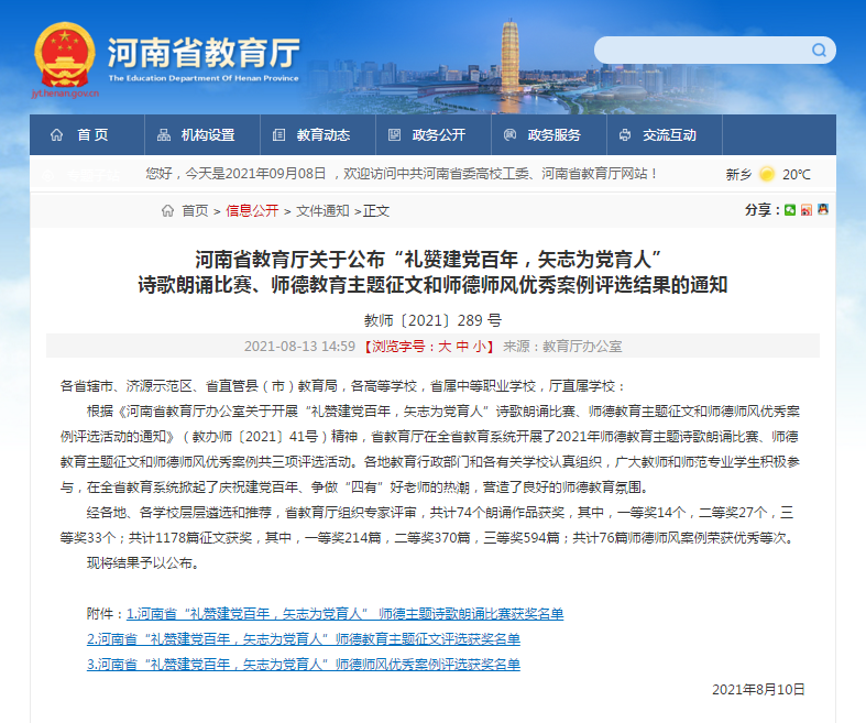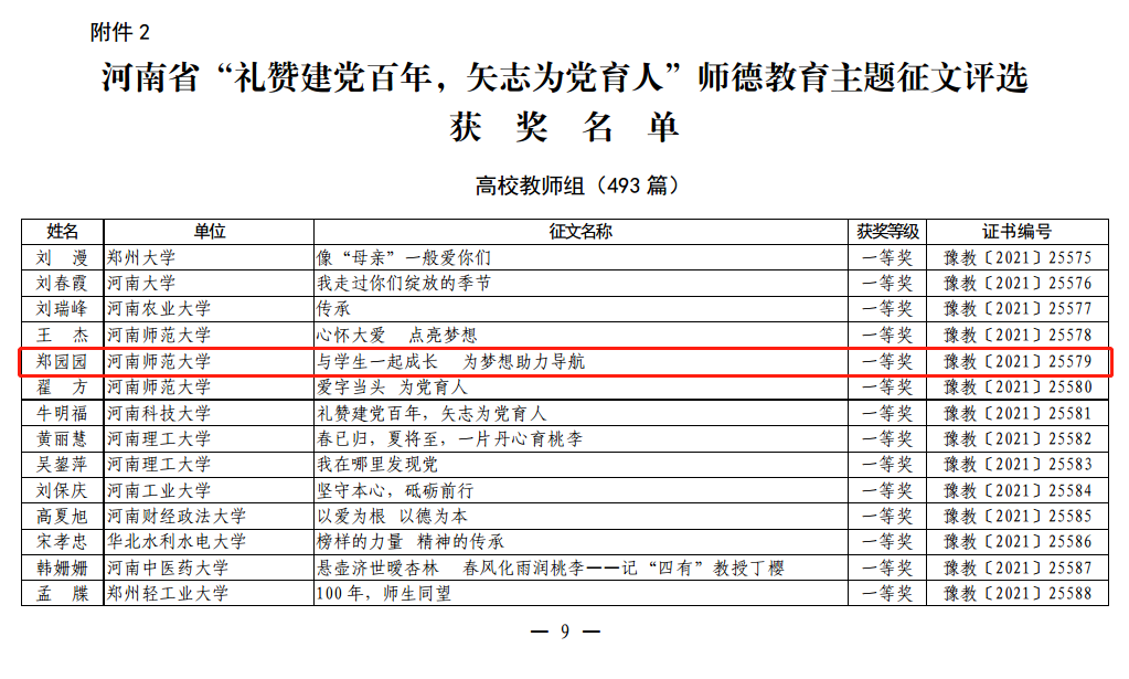 近日,河南省教育厅下发了《关于公布“礼赞建党百年,矢志为党育人”诗歌朗诵比赛、师德教育主题征文和师德师风优秀案例评选结果的通知》(教师〔2021〕289 号),我院教师郑园园获得师德教育主题征文一等奖,特向全院师生报喜。
