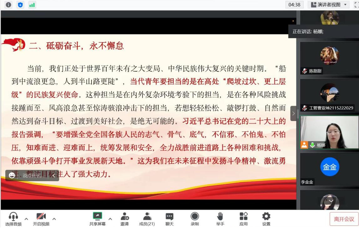 活动中,学院党委书记李志前以党的二十大报告要点为主线,重点对党的二十大精神的丰富内涵和核心要义等方面进行了详细解读,并结合青年学生实际,对报告中关于青年和青年工作的论述进行了深入浅出的解读,引导学生深入学习党的二十大精神,从党史中汲取奋进力量,让青春在全面建设社会主义现代化国家国家的火热实践中绽放绚丽之花。