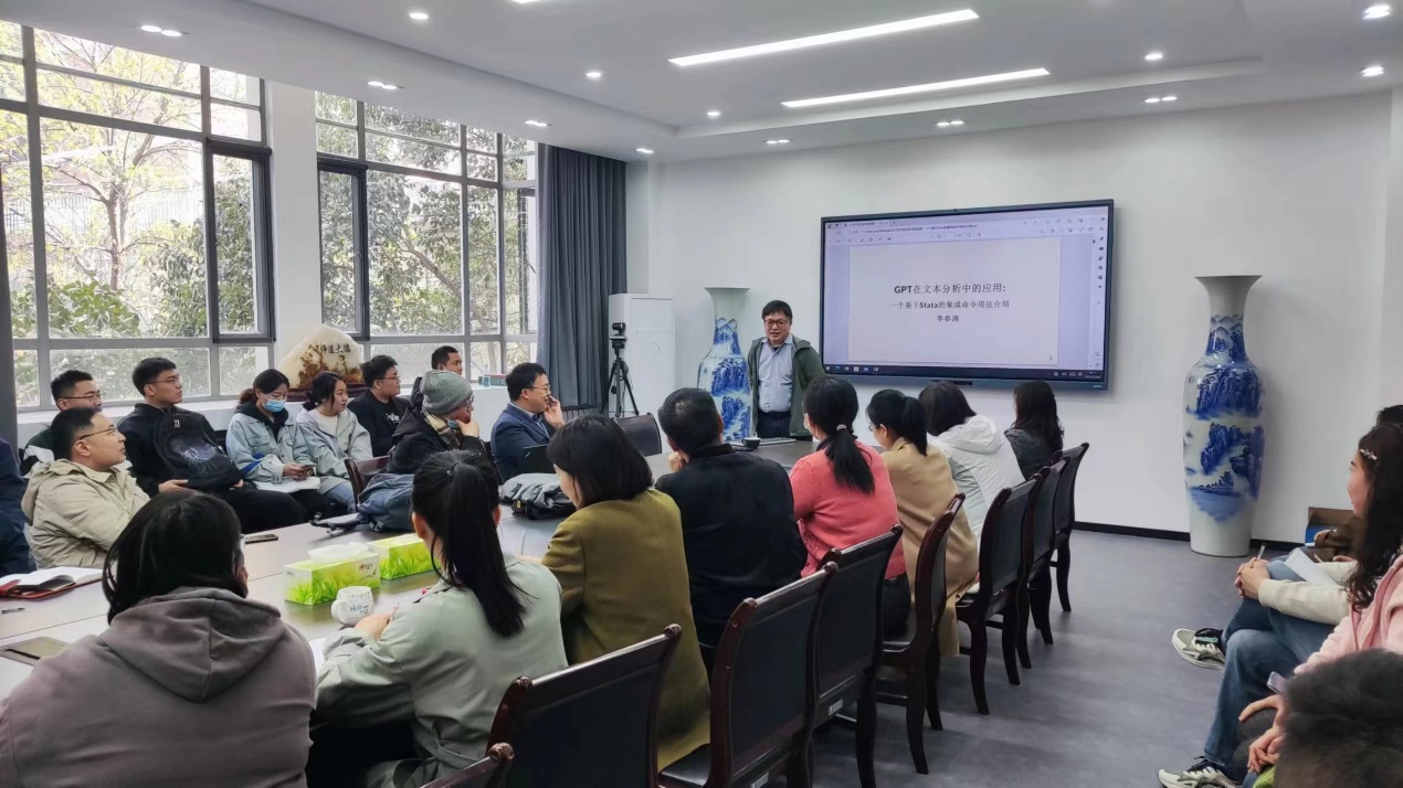3月28日上午,河南大学李春涛教授应商学院邀请,在学院二楼会议室为50余位教师和研究生代表作了题为《GPT在文本分析中的应用:一个基于Stata的集成命令用法介绍》的学术报告,报告由海本禄副院长主持。
