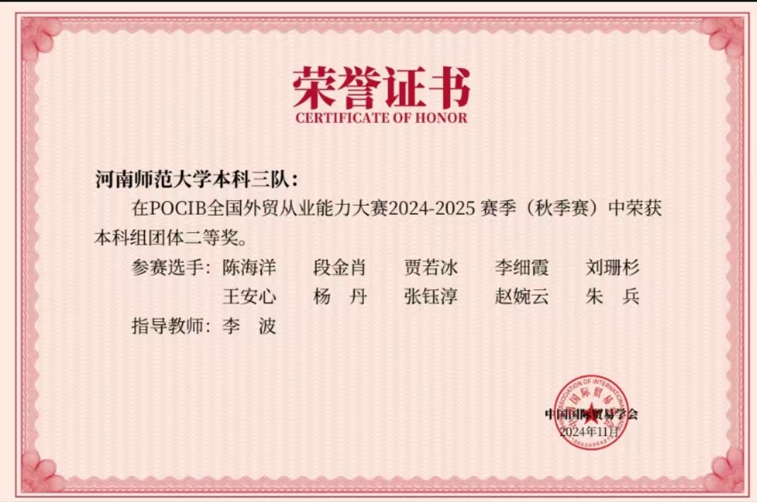 本次比赛由河南师范大学商学院李波博士担任指导老师。比赛前期,参赛队员们通过咨询、信息搜集等方法对POCIB有了基本认识,并根据现有知识储备互相学习、积极沟通,不断提升数字贸易分析能力和数据化运营核心技能。比赛过程中,团队成员熟练运用Excel、POCIB运营软件等,对市场数据进行深入分析和挖掘,挖掘隐藏在数据背后的深层规律,寻找目标客户快速完成贸易。同学们凭借扎实的数据分析功底、贸易博弈的思维和坚持到底的品质,不断尝试新的方法和策略,逐渐掌握比赛节奏,展现出团队在数字外贸领域的专业素养和综合能力,彰显出学院学子出色的适应能力和团队协作精神。在全体参赛成员的共同努力下,河南师范大学商学院本科二队、本科三队分别荣获第十四届POCIB全国外贸从业能力大赛2024-2025赛季(秋季赛)本科组团体一等奖、本科组团体二等奖。