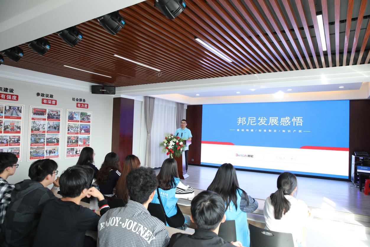 活动伊始,河南邦尼生物工程有限公司相关负责人对商业英才实验班的到来表示热烈欢迎,并带领学生深入邦尼生物生产、运营区域,帮助同学们直观了解企业生产与运营流程,深刻感受科技创新与企业文化的魅力。随后,总经理李宁开展专题讲座,他将当下时代发展趋势与个人成长经历相结合,从取势、明道、优术三个维度入题展开叙述,鼓励学生知“取势”,于广读博览中培养宏观视野,洞察行业趋势;善“明道”,于自我认知中强化个人优势,走好职业道路;培“优术”,于实践笃行中整合发展资源,提升专业技能。同时,他强调企业文化的向心力、团队协作的凝聚力,以及持续学习和自我革新的驱动力,引导学生在动态职场环境中精准定位,以开放姿态拥抱多元职业路径。在互动问答环节,现场气氛热烈,同学们踊跃发言,李宁就招聘标准、专业与职业的关系等问题给予详细解答,为同学们的职业发展提供切实可行的指导。